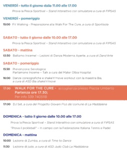 Sabato 25 ottobre alle 17.30 presso Piazza Umberto I si svolgerà inoltre la WALK FOR THE CURE, passeggiata solidale per la promozione della salute femminile. Ogni partecipante,  con una donazione di 10 euro riceverà la maglia Walk For the Cure dedicata alla Sardegna.